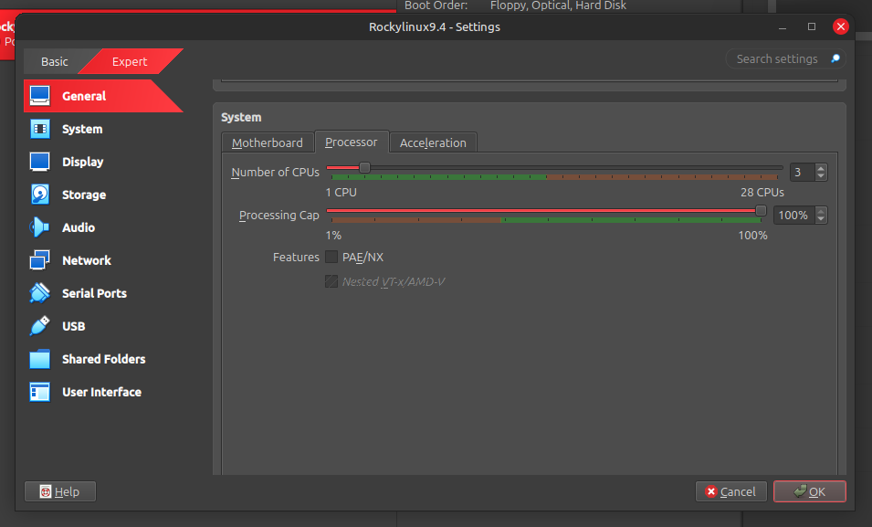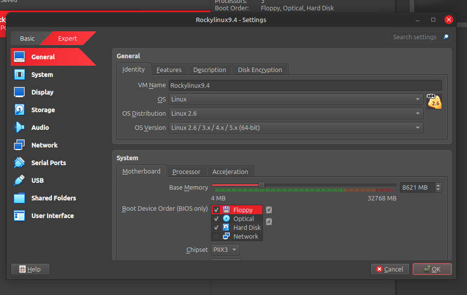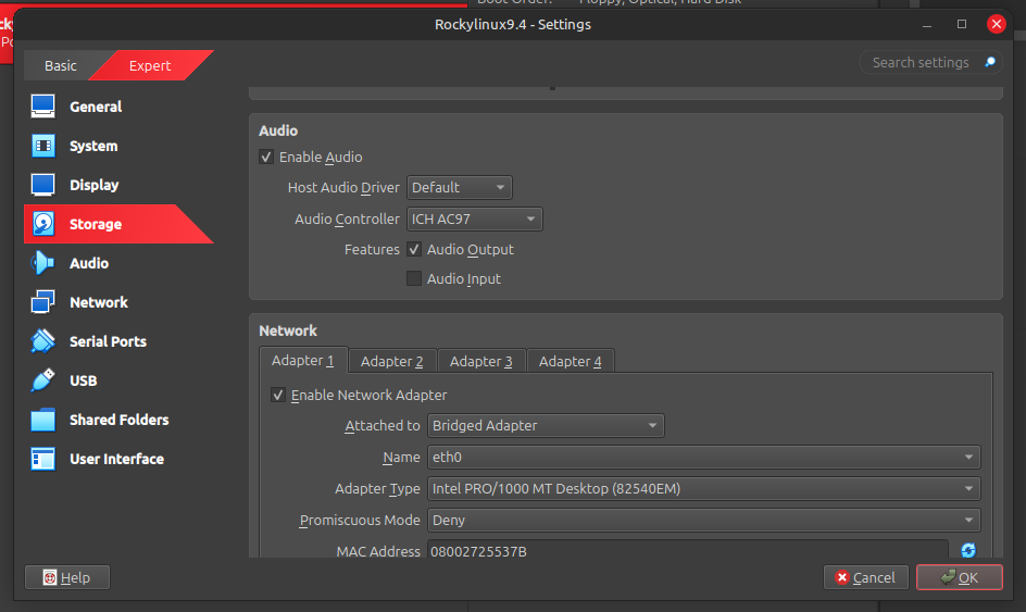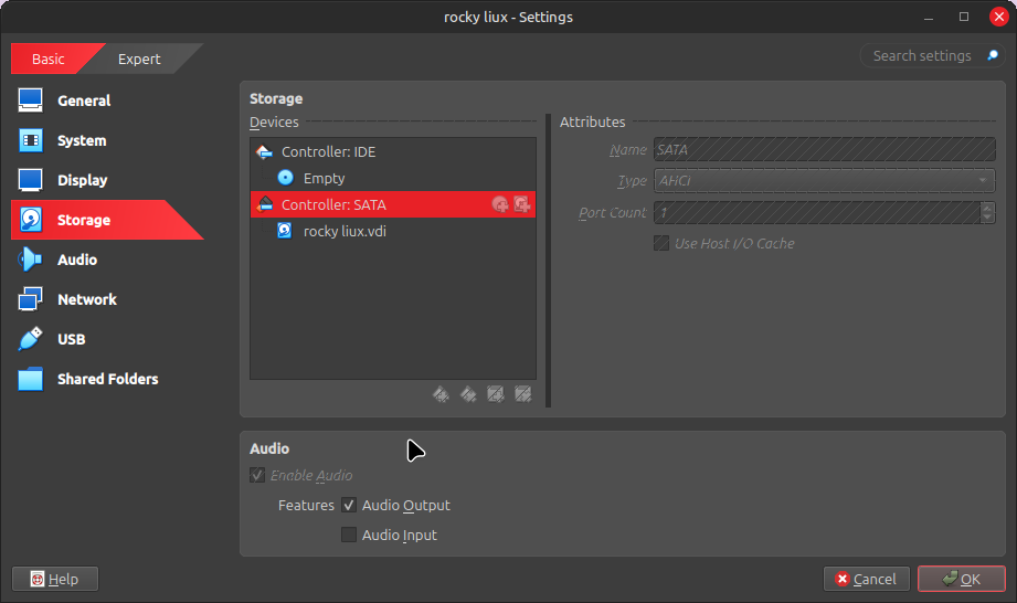 • A Settings → Storage vaig muntar la ISO de Rocky Linux.