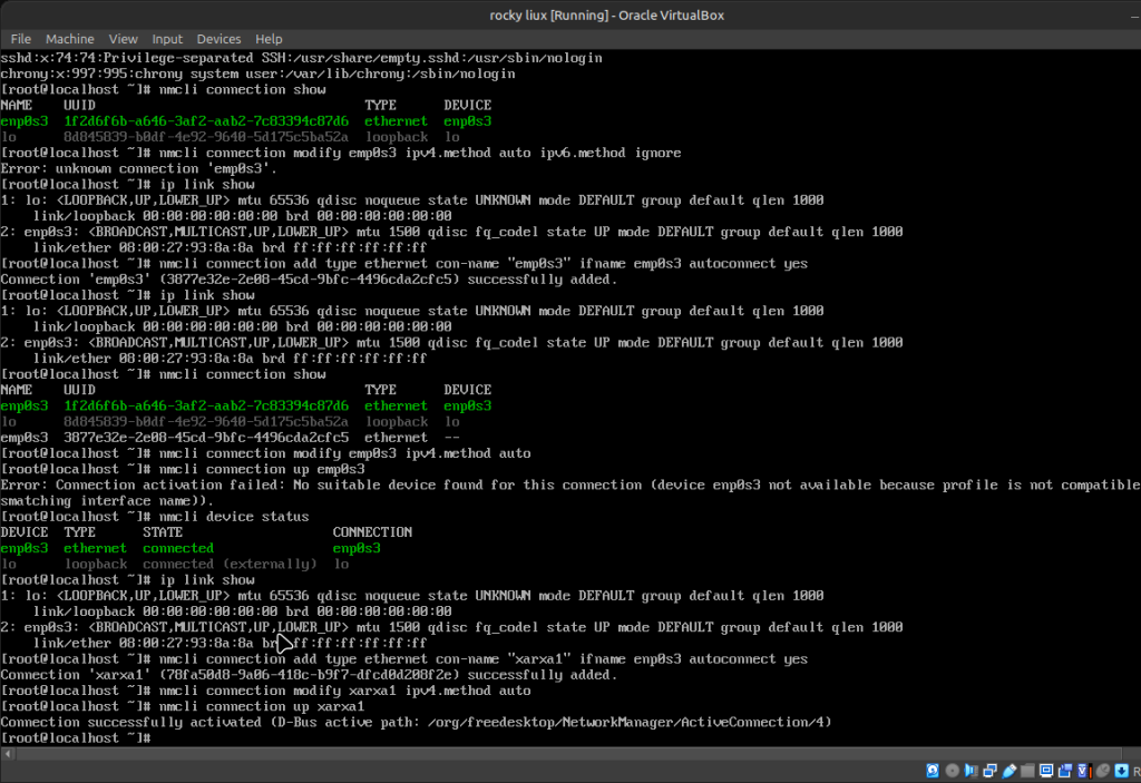 He configurat la interfície de xarxa enp0s3 amb DHCP. Primer vaig comprovar les connexions amb nmcli connection show i després vaig crear una nova connexió amb: