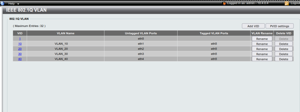 Els ports eth1–eth4 són ports d’accés (untagged) per dispositius de cada VLAN.
