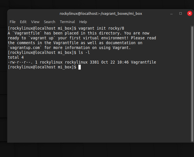 vagrant init rocky/8 rocky/8→ Box pública de Rocky Linux 8.Aquesta comanda crea un fitxer