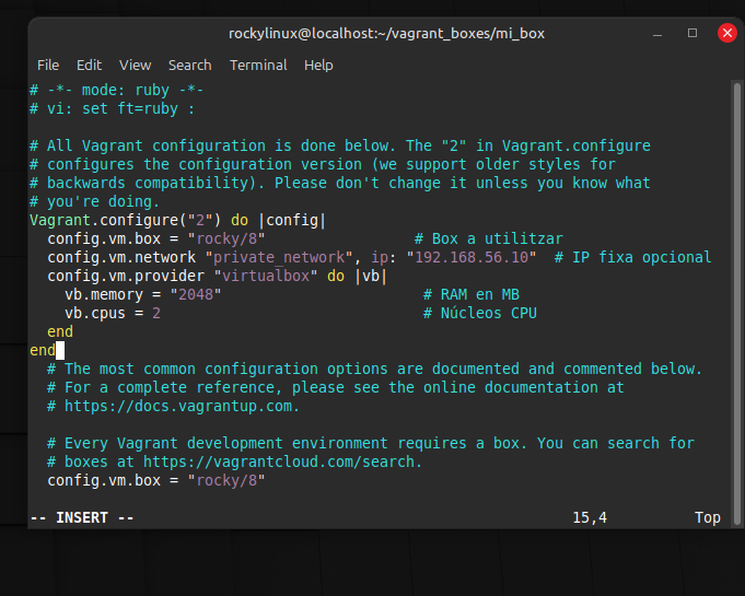 cd ~/vagrant-rocky Això crea un fitxer Vagrantfile.