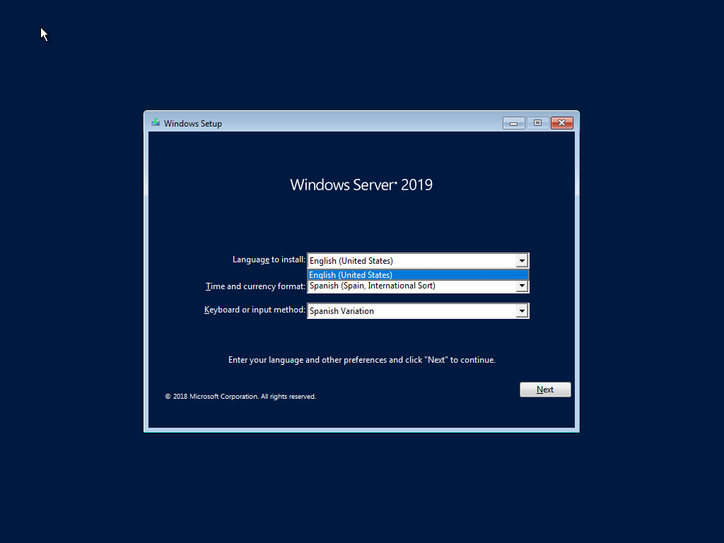 En aquest cas s’ha deixat English (United States) per a l’idioma d’instal·lació i Spanish com a format de data/hora si cal.