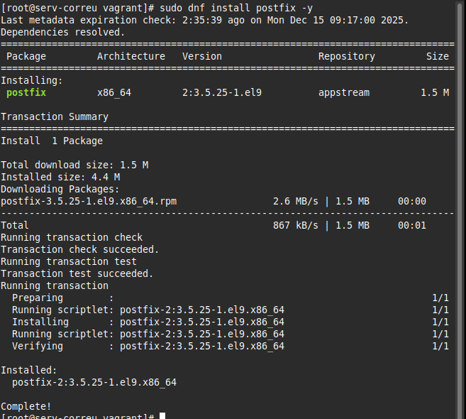 Utilitzo dnf perquè Rocky Linux és basada en Red Hat, i dnf és l’eina de gestió de paquets estàndard. Instal·lo Postfix des dels repositoris oficials per garantir seguretat i compatibilitat.