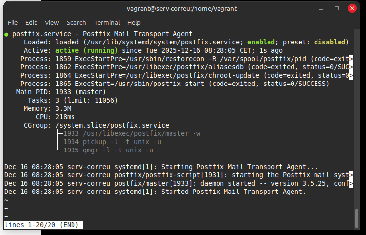 Reinicio Postfix per aplicar els canvis, sense reinici, els canvis no s’apliquen. Això assegura que la configuració nova estigui activa. I verifico que no hi hagi errors.