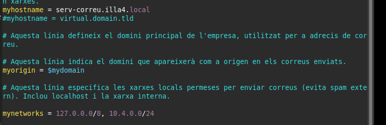 vim /etc/postfix/main.cf Aquest fitxer controla el comportament global de Postfix. Canviem només el necessari per mantenir la configuració neta i evitant errors.