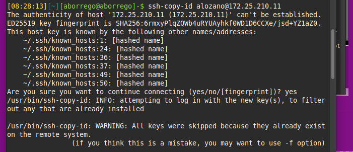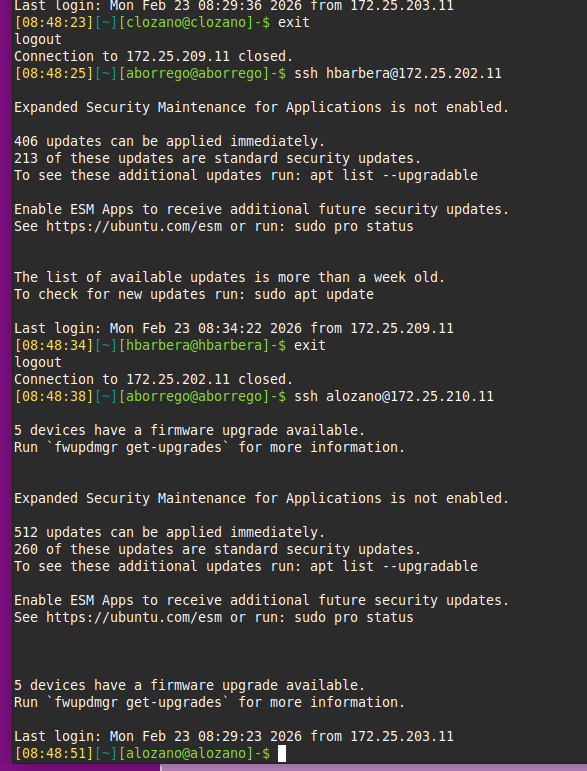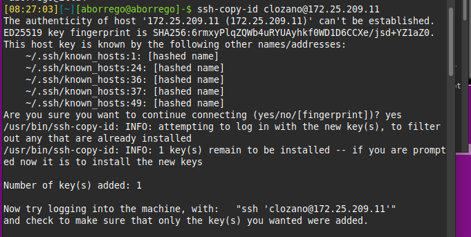 February 23, 2026 by aborrego Compartició de claus SSH amb els companys Tornar al repte 2.3 ObjectiuQue tothom de l’equip actual pugui fer ssh usuari@ip_usuari sense posar contrasenya entre tots.Que ningú de fora de l’equip actual (ni equips anteriors) hi tingui accés. Copia la teva clau pública (la que donaràs als altres)Executa aquest comandament per veure-la i copiar-la fàcilment. Un cop la tens copia tot el text que surt. Copia tot el text que surt i envia la teva clau pública a tots els companys i al professor. Tothom hauria de fer el mateix. cat ~/.ssh/id_ed25519.pub Afegeix les claus públiques dels companys al teu portàtil ssh-copy-id usuari@192.168.1.55 Copiar al portàtil del Cristian: Copiar al portàtil de l’Andres: Copiar al portàtil de l’Hector: Ara podem fer ssh amb els nostres companys d’equip. Ells fan el mateix desde la seva màquina i podem connectarnos a la màquina de cada un de l’equip.