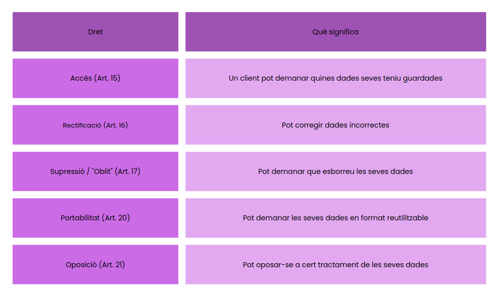 Com qualsevol empresa que opera a la Unió Europea, estem obligats a complir el Reglament General de Protecció de Dades (RGPD) — Reglament (UE) 2016/679, en vigor des del 25 de maig de 2018. A nivell estatal, també s’aplica la LOPDGDD (Llei Orgànica 3/2018, de 5 de desembre).