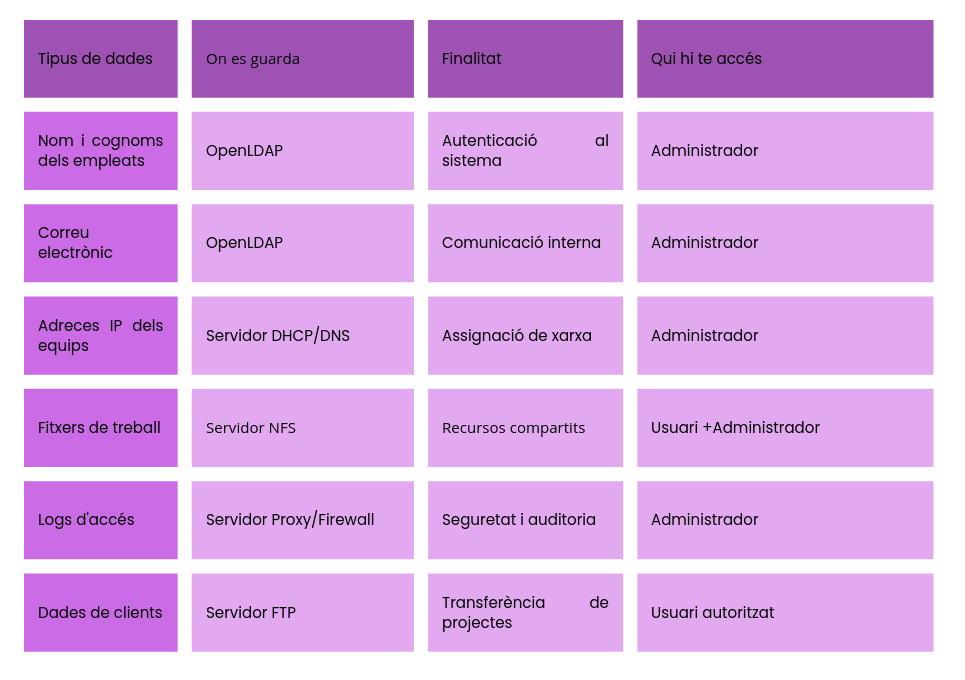 L’empresa gestiona dades de clients (projectes creatius, correus, facturació) i de treballadors (credencials LDAP, directoris NFS, logs del sistema). Si no protegeix aquestes dades: