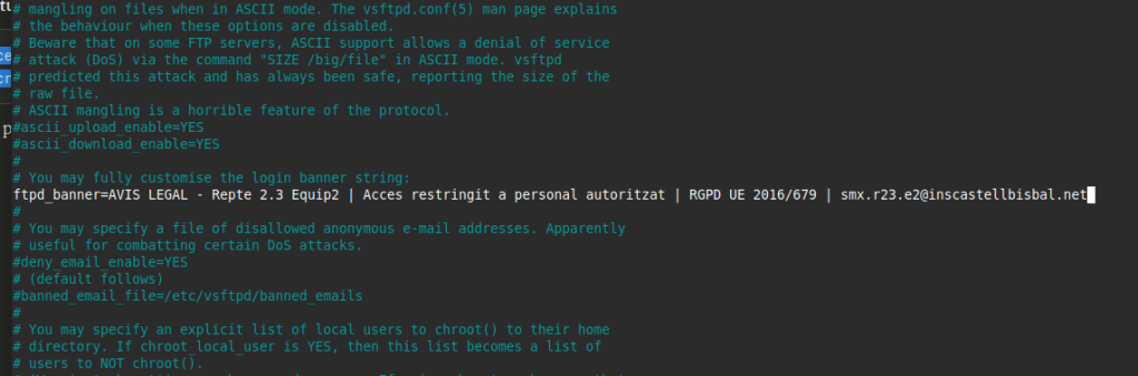 Dins del fitxer, es localitza la directiva ftpd_banner (existent prèviament) amb la drecera de cerca Ctrl+W. Es substitueix el contingut per el text legal RGPD: