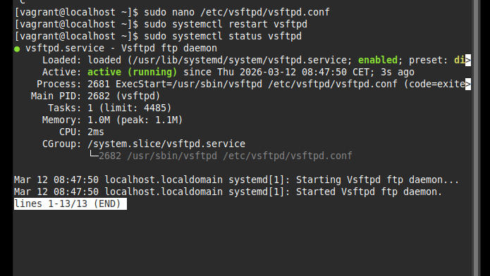 Per aplicar els canvis al fitxer de configuració, cal reiniciar el servei vsftpd. I verifiquem que aquest segueix actiu correctament: