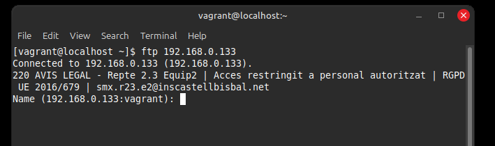 el servidor ha respost correctament mostrant el missatge d’avís legal just en el moment de la connexió, abans de sol·licitar cap credencial a l’usuari. El codi de resposta 220 del protocol FTP ha retornat el text configurat
