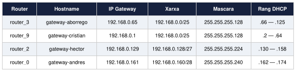 router diferent. Tots comparteixen la mateixa xarxa base 192.168.0.0/24 però segmentada amb màscares